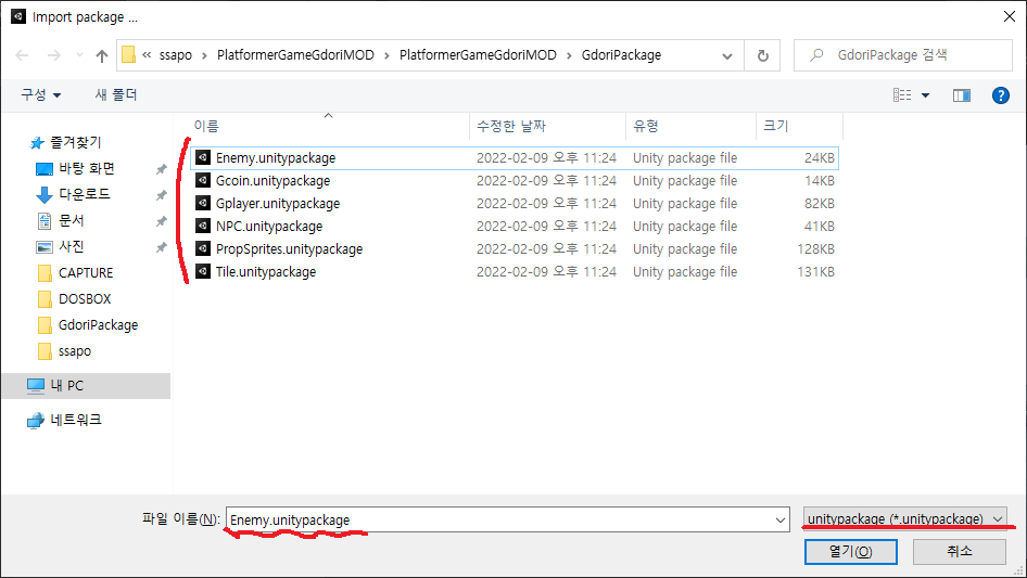 import package에 대한 윈도우 선택창이 뜨면 .unitypackage 확장자로